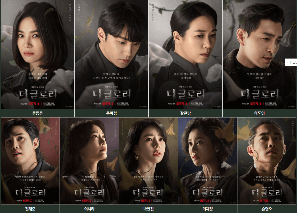 넷플릭스에서 12월 30일에 공개 된 '더 글로리'가 공개된지 3일만에 아시아 9개국에서 1위를 차지하며 뜨거운 반응을 얻고 있습니다. 배우 송혜교, 이도현, 임지연등이 출연하며 <미스터 선샤인>, <태양의 후예>등으로 널리 알려진 김은숙 작가가 의기투합해 공개 전부터 화제였는데요.