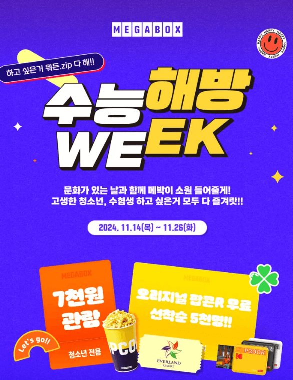 - 영화 티켓 할인: 수험생과 청소년 대상 7,000원 영화 관람권 제공.